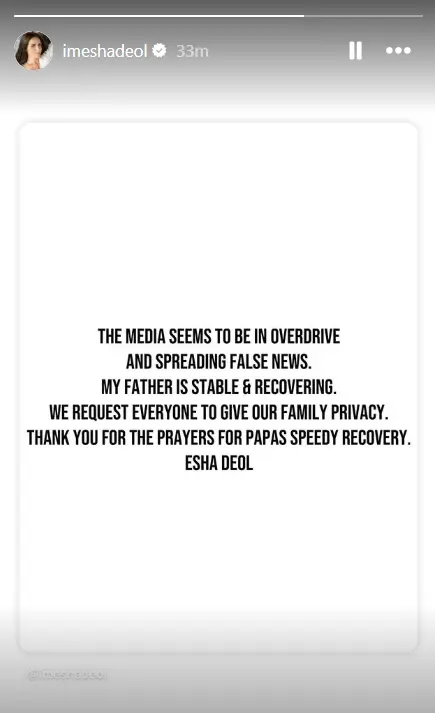 એશાએ એક સત્તાવાર પોસ્ટ શેર કરીને લખ્યું, “સોશિયલ મીડિયા ખોટા સમાચાર ફેલાવવા માટે ખૂબ જ ઝડપી છે. મારા પિતા સ્વસ્થ છે અને સ્વસ્થ થઈ રહ્યા છે. અમે દરેકને અમારા પરિવારને ગોપનીયતા આપવા વિનંતી કરીએ છીએ. બધાની પ્રાર્થના બદલ આભાર.”